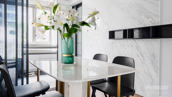白色簡易餐桌搭配黑色座椅,給人一種簡約明亮的感覺,餐桌上的小花也使得餐廳多了一點(diǎn)生機(jī).