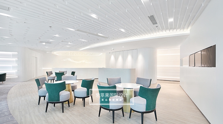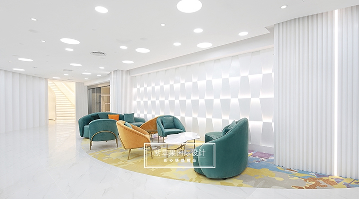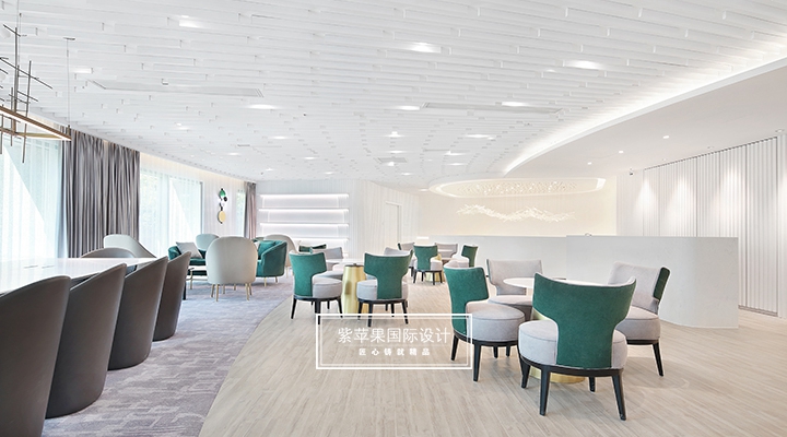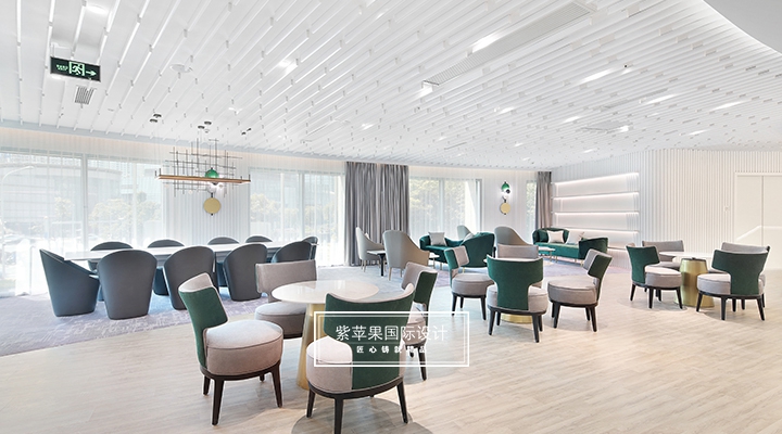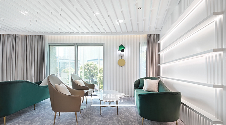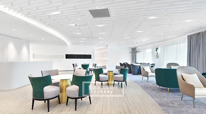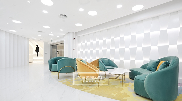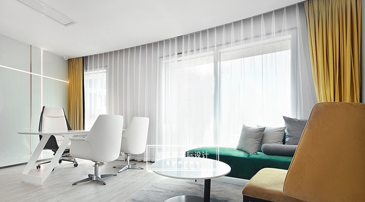 大堂設計貼合現(xiàn)代極簡理念,充分利用空間安置多功能區(qū),大面積留白的區(qū)域搭配由明黃、湖綠和金屬色組成的軟裝,軟硬裝格調(diào)統(tǒng)一凸顯質(zhì)感。二樓地面多采用地板、地毯等材質(zhì),有效降低女士腳踩高跟鞋發(fā)出的噪聲干擾,也會提高她們在走路時感受到的舒適感。洽談區(qū)的落地玻璃窗廣納自然光線,將朝暮風光、四時景致全盤納入其中,為空間點染別樣雅致的氣息。