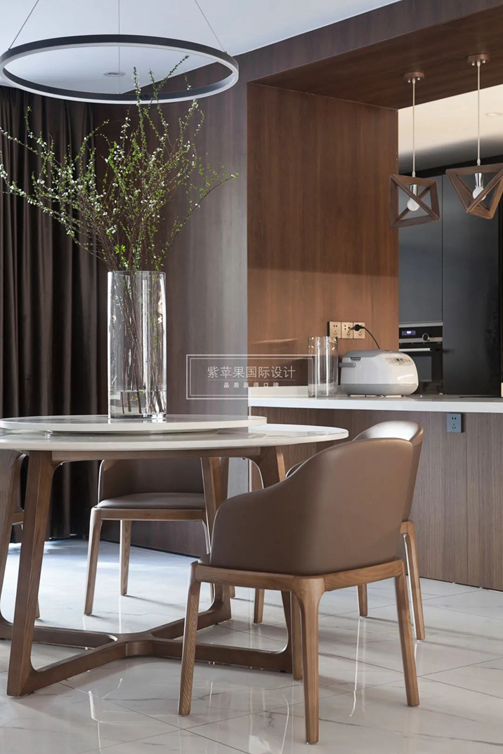 胡桃木質(zhì)幾何吊燈沖淡了“煙火氣”的油膩