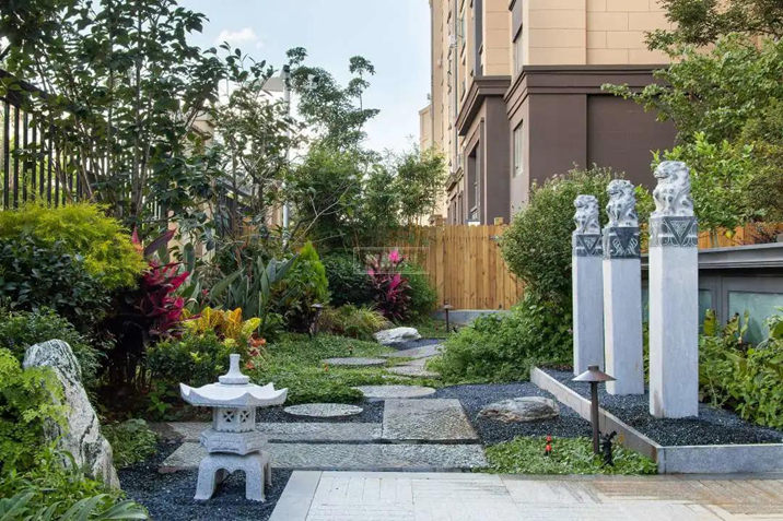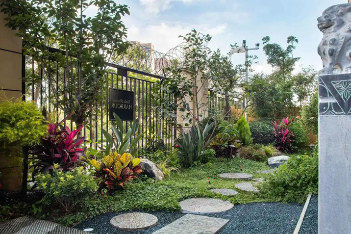 曲折的步道融入在郁郁蔥蔥的花木中