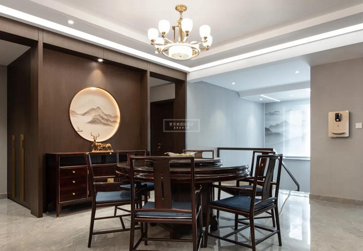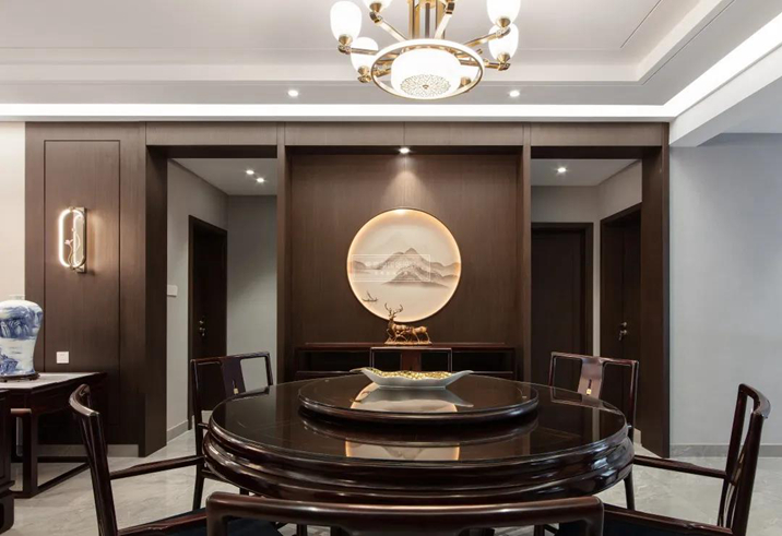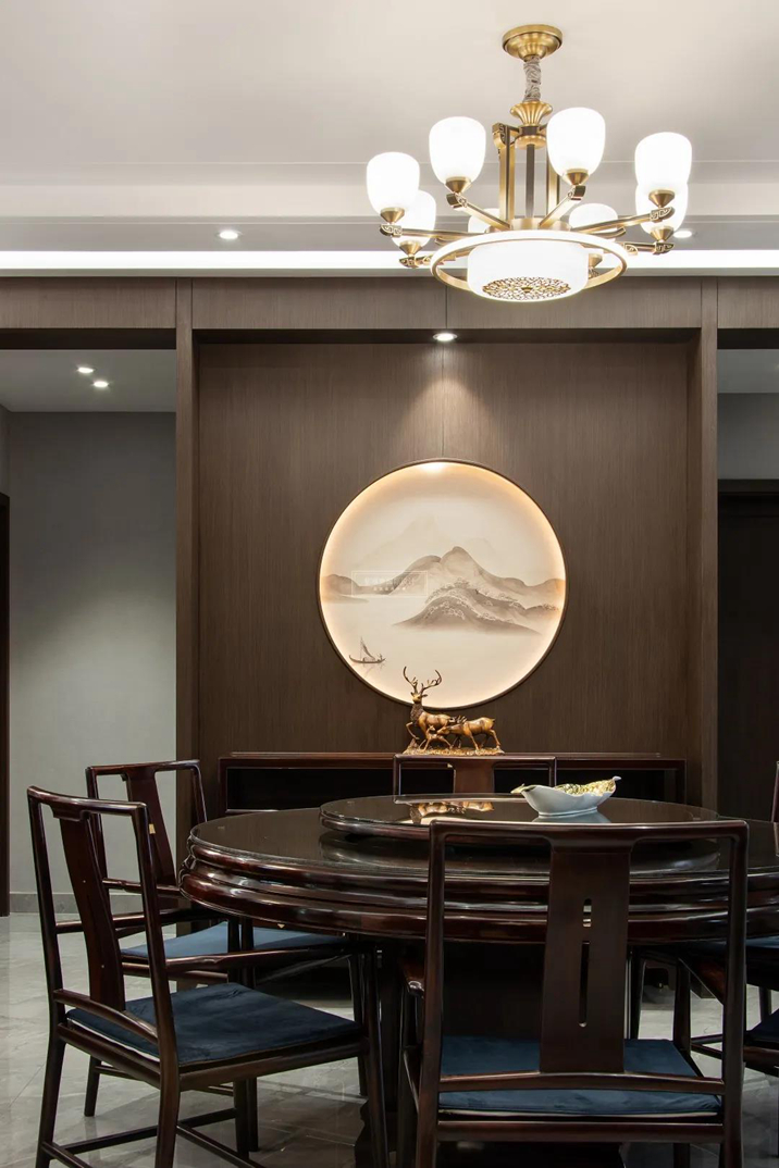 在傳統(tǒng)文化中美食一定是占比最多的一個,用餐要有儀式感,圓桌匯聚人氣更匯聚情感交融,配合從客廳延續(xù)過來的線條張弛有度形成空間獨特的韻律協(xié)調(diào)。