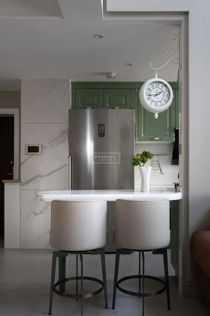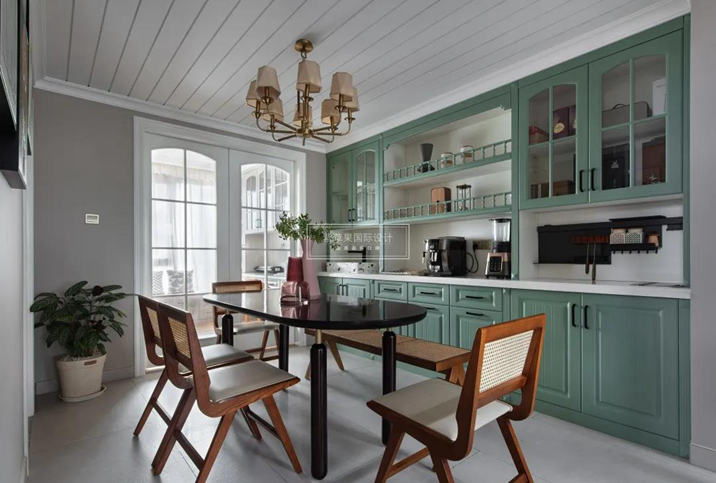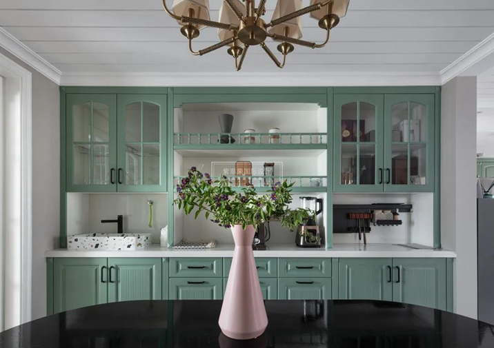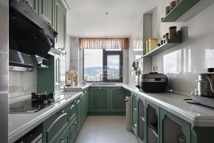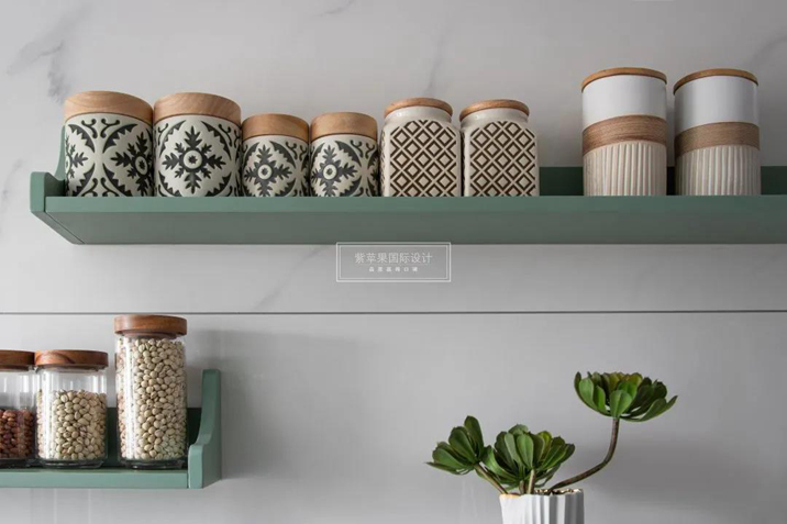介于寶石綠和湖綠之間的過渡色帶來生機,淡化廚房里的喧雜和煙火軟化生活的棱角。